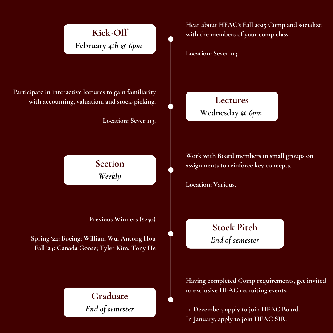 Graduates join a community of 800+ members, gain access to HFAC’s mailing list with exclusive job postings and opportunities, receive invitations to exclusive recruiting events and speaker series, and are invited to apply to manage the $100,000 fund.